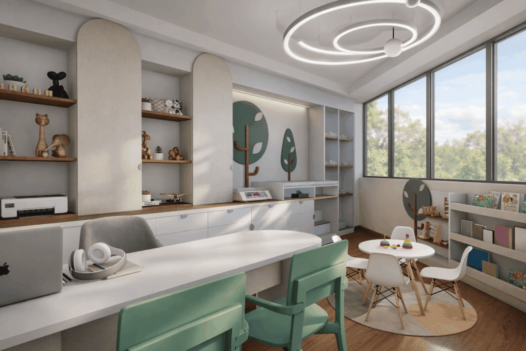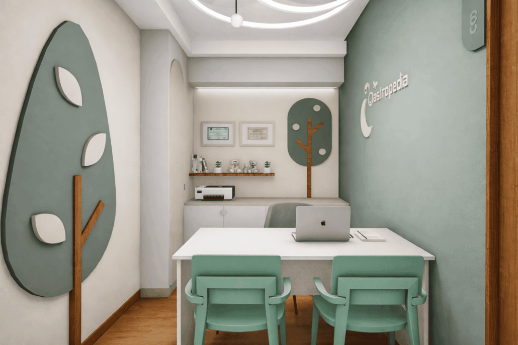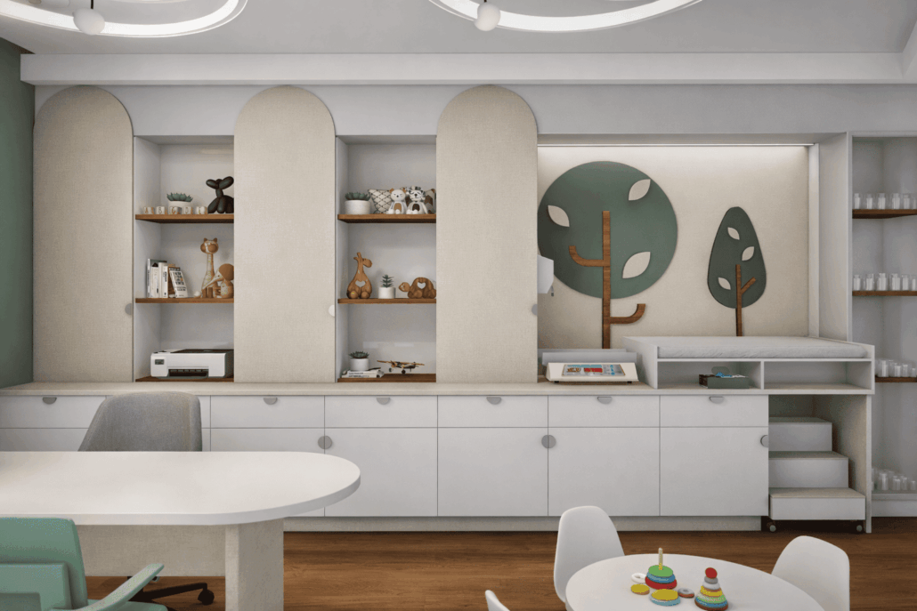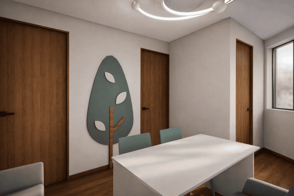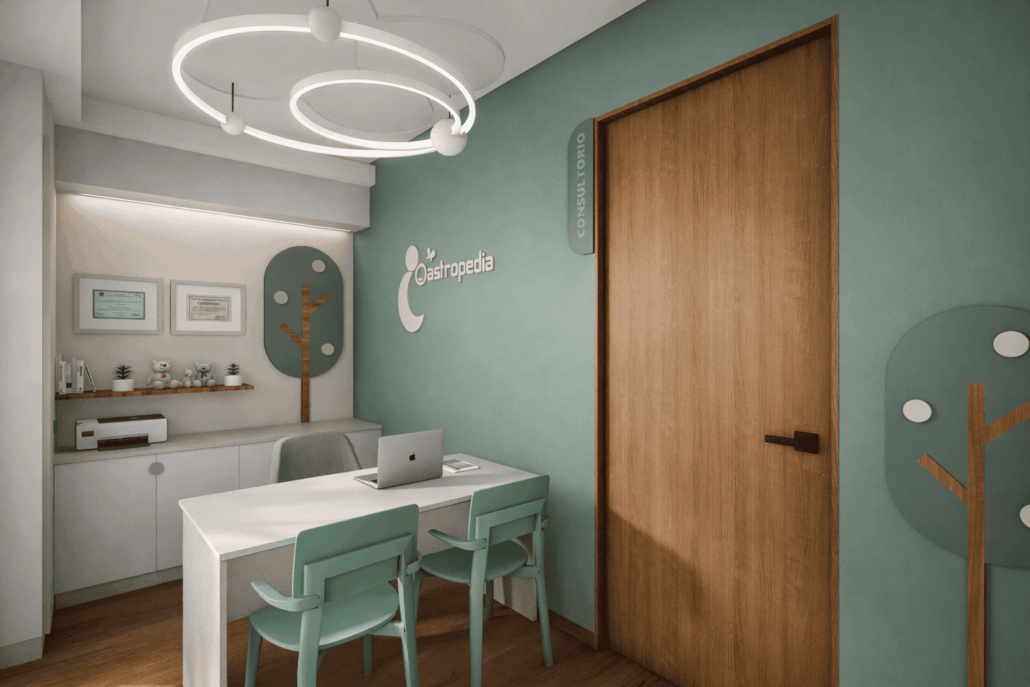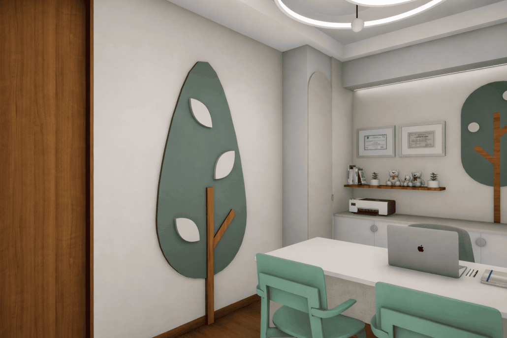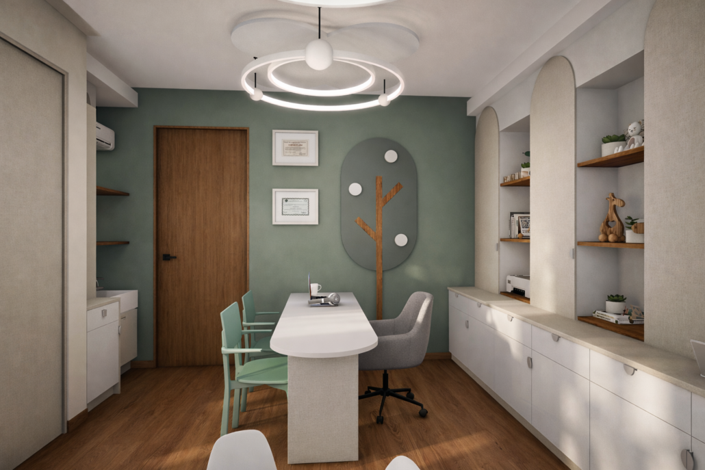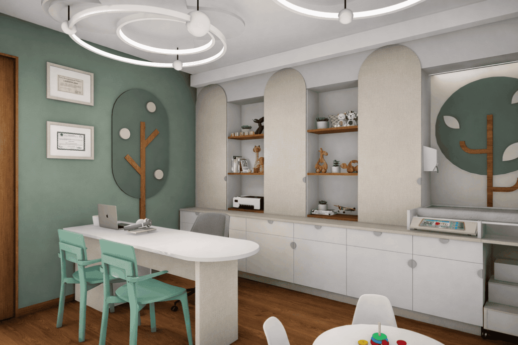 Propuesta de diseño de interiores para el consultorio pediátrico de la Dra. Claudia Leija. Con un concepto amigable y lleno de detalles que dan al paciente tranquilidad y motivación al estar dentro de la consulta.